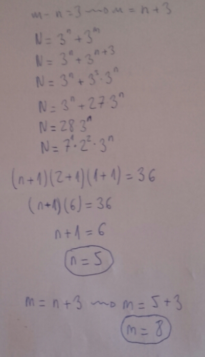 Si m y n son dos números cuya diferencia es 3. Halla m +n Si N = 3^n + 3^m tiene 36 divisores, Me ayudan con el planteo,