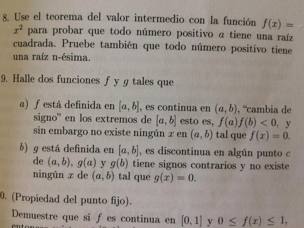 Buenos días Unicoos , tengo una duda sobre la 9 (a) porque resulta que en clase vimos que el teorema de Bolzano garantiza que si F es continua en [a,b] y f(a) y f(b) son de signo contrario existirá al menos un C e (a,b) tal que F(c) = 0 , y problema me dice que no existe ningún número en ese intervalo tal qué su imagen me de como resultado 0 , así que no sabría por dónde empezar.