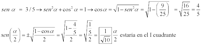 " Si α es un ángulo del segundo cuadrante y sen α = 3/5, calcula las razones de α/2 " .