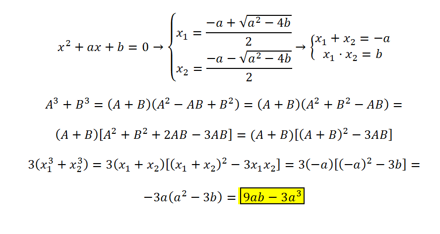El triple de la suma de los cubos de los ceros de x^2 +ax+b es igual a: