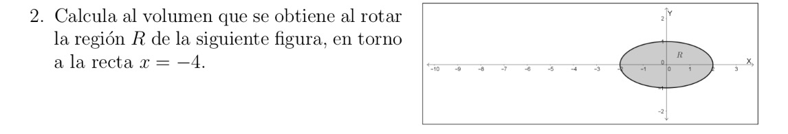 Luego, puedes plantear el volumen pedido como la resta entre el volumen generado al rotar la mitad derecha menos el volumen generado al rotar la mitad izquierda de la elipse, alrededor de la recta de ecuación x = - 4 (revisa tus apuntes de clase para ver las expresiones de los volúmenes de revolución alrededor de ejes paralelos al eje de ordenadas OY):