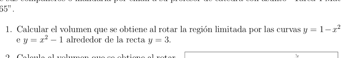 Vb = π*∫ ( - 2*√(1 - y2) - (-4) )2*dy = π*∫ ( - 2*√(1 - y2) + 4 )2*dy, para evaluar con Regla de Barrow entre y = -1 e y = 1;