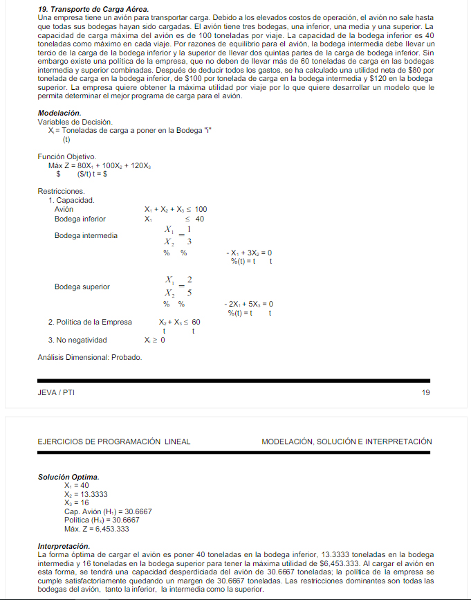 Debido a los elevados costos de transporte, cada camión no se despacha hasta que toda su capacidad de almacenamiento esté completamente cargada. Cada bus tiene tres bodegas internas: inferior, media y superior. Debido al limitante de espacio que hay, cada camión no puede llevar más de 90 toneladas de carga en cada viaje: la bodega inferior debe llevar máximo 40 toneladas de carga, la bodega intermedia debe transportar 1/3 de la carga de la bodega inferior y la bodega superior debe llevar 2/7 partes de la carga de la bodega inferior. Sin embargo, no se deben llevar más de 53 toneladas de carga entre las bodegas media y superior. Las utilidades por el transporte son de 11000 u.m. por tonelada de carga en la bodega inferior, 10000 u.m. por tonelada en la intermedia y 12000 u.m. en la superior, después de deducir los gastos. Plantear un modelo de Programación Lineal par determinar la forma de cargar el camión que maximice las utilidades.
