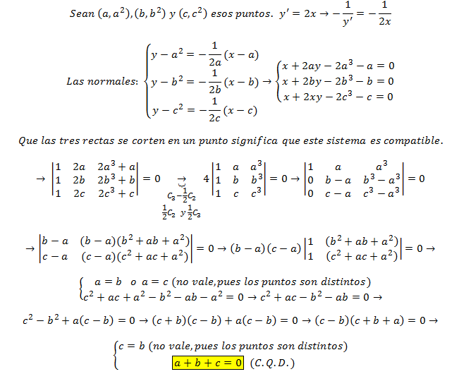 Supón que tres puntos sobre la parábola y = x2 tienen la propiedad de que sus rectas normales se cruzan en un punto común. Demuestra que la suma de sus coordenadas x es cero.