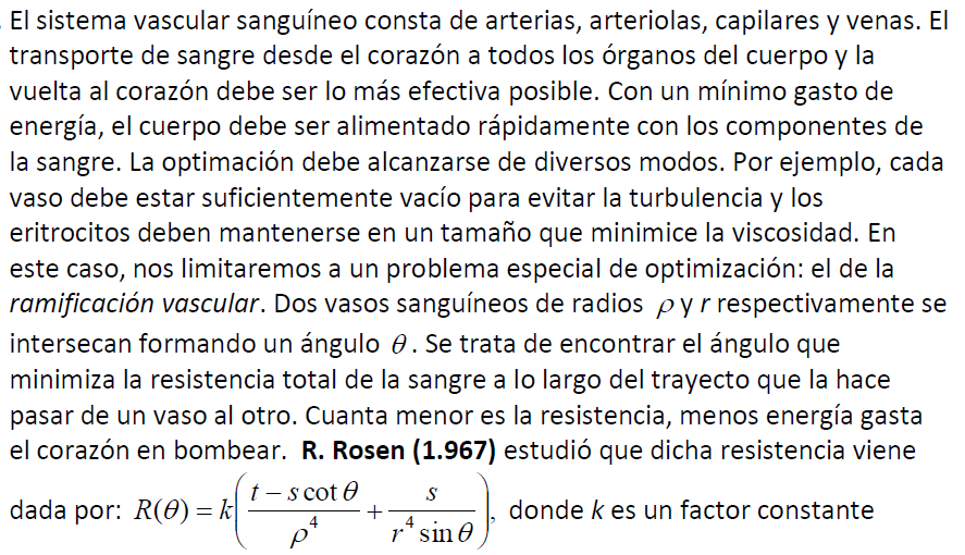 El sistema circulatorio está formado por vasos sanguíneos ( arterias, arteriolas, capilares, y venas) que conducen la sangre del corazón a los órganos, y de nuevo al corazón. Este sistema debe funcionar con el gasto mínimo de energía. Así, es razonable suponer que cuando una arteria se ramifica, el ángulo entre la arteria madre y la hija debe hacer mínima la resistencia al flujo de la sangre, dado que la energía disminuye si lo hace la resistencia mencionada.