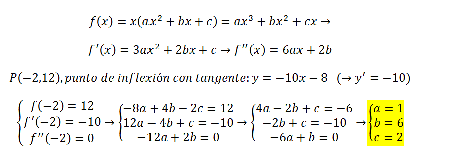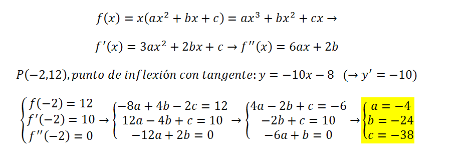 -Determinar el valor de las constantes a, b, c sabiendo que f(x) = x(ax2 + bx + c) tiene un punto de inflexión en (-2,12) y que en dicho punto la recta tangente es 10x + y + 8 = 0.