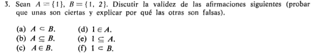 (e) Falsa. Como que 1 no es un conjunto, no podemos tener 1 ⊆ A.