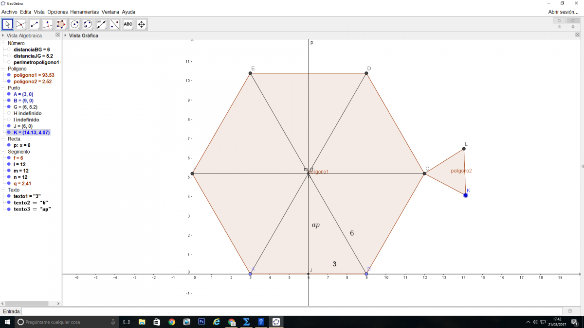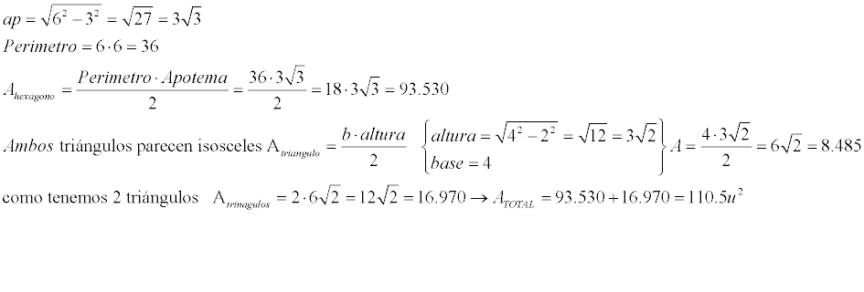 Ejercicio 98 b) determina el área y el perímetro de la zona sombreada de la figura b). Datos base del triángulo 4 cm y lado del hexágono 6 cm.