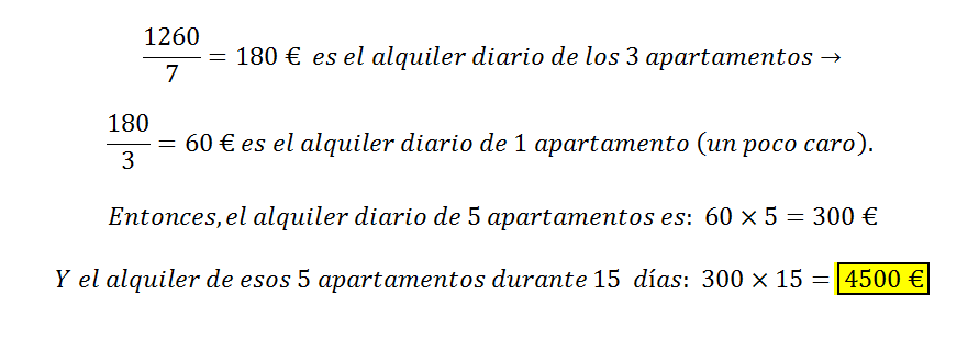 El alquiler de 3 apartamentos durante 7 días es 1260€ ¿cuanto costara el alquiler de 5 apartamentos durante 15 días?