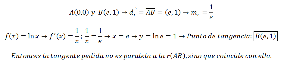En que punto de la función f(x) = In (x) , la recta tangente es paralela a la recta que pasan los puntos A (0,0) y B (e,1) ?