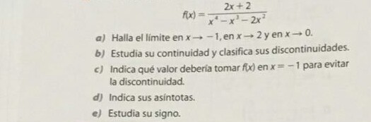 Hola, en esta función me salen 3 asintotas verticales en los puntos donde la función no existe, es decir, x=0 x=-1 x=2 y una asintotas horizontal en y=0. La función no es continua y las discontinuidades que presenta son inevitables de tipo asintotas. Si lo dicho es correcto, no entiendo que es lo que tengo que hacer en el apartado C y E.