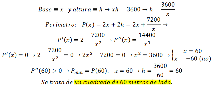 Hallar las dimensiones de un campo rectangular de 3600metros cuadrados de superficie, para poderlo cercar con una valla de longitud mínima.