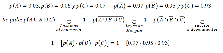Una persona compra tres rifas, las probabilidades de ganar el premio en cada una de ellas es de 0.03, 0.05 y 0.07. ¿Cuál es la probabilidad de ganar en al menos una de ellas?