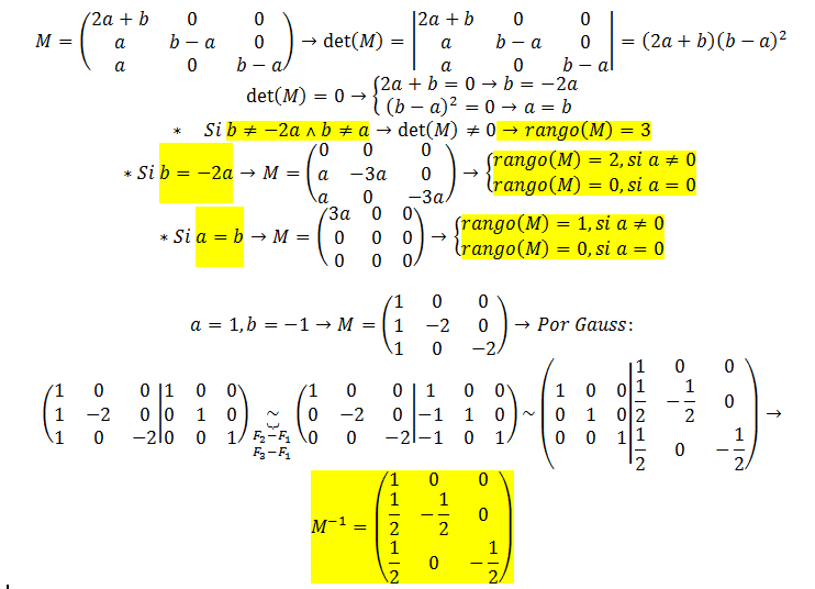 Te dan la matriz M en función de dos parámetros y te piden que calcules su rango que, evidentemente, dependerá del valor que tomen dichas variables. Lo que tienes que hacer es calcular el determinante de M, que quedará en función de a y de b. Tienes que igualar el determinante a 0 y resolver el sistema de ecuaciones (y te adelanto que, viendo el apartado b, a=1 y b= -1 son, como mínimo, una posible solución).