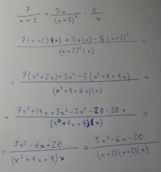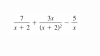 7/(x + 2) + 3x/( x + 2)2 - 5/x = sustituimos las expresiones de los términos: