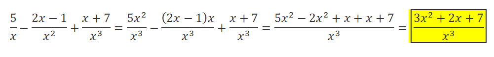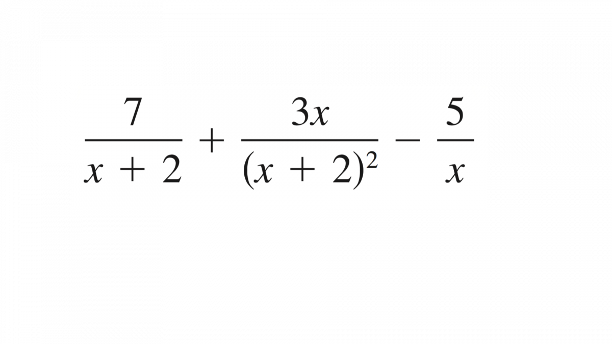 = 7x(x + 2) / x(x + 2)2 + 3x2 / x(x + 2)2 - 5(x + 2)2 / x(x + 2)2 = extraemos denominador común (observa que los tres denominadores son iguales):