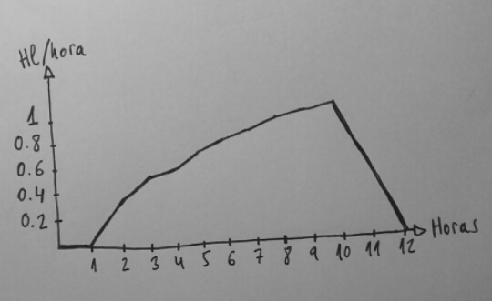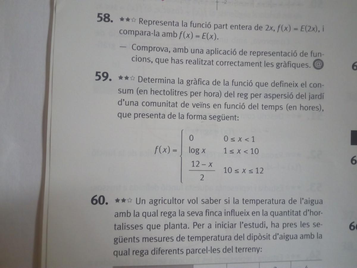 calcula: a) la temperatura a las tres de la tarde (15 horas) b) ¿A qué hora hará una temperatura de 12 ° c) Las temperaturas máximas y mínimas.Ejercicio 59: Determina la gráfica de la función que define el consumo (en hectolitros por hora) del riego por aspersión del jardín de una comunidad de vecinos en función del tiempo (en horas), que presenta de la forma siguiente.