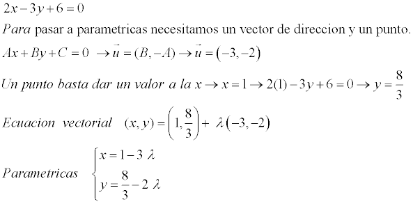 Una forma de conseguir las ecuaciones paramétricas de una recta es con un punto y un vector director de la misma, por lo tanto debes encontralos. Para ello debes hallar 2 puntos de la recta, luego calcula, con ellos, el vector director de la recta, y por último escribes las ecuaciones paramétricas con los datos obtenidos.