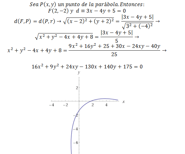 Determinar la ecuación de la parábola cuyo foco es (2,-2); su directriz es 3x-4y+5=0. Además determinar coordenadas del vértice, la longitud del lado recto y la ecuación del eje focal.