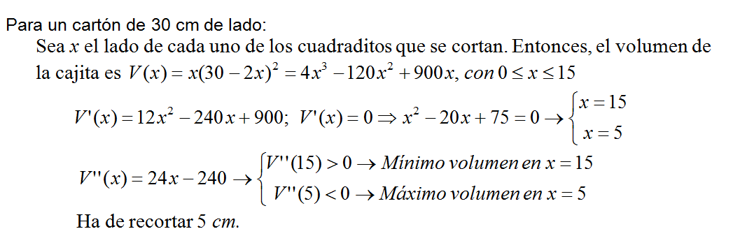 Tenemos un cartón cuadrado de 6cm de lado y queremos construir con él un caja sin tapa. Para elo recortamos un cuadrado de x cm de lado en cada vértice del cartón. Calcular x para que el volumen de la caja sea máximo.