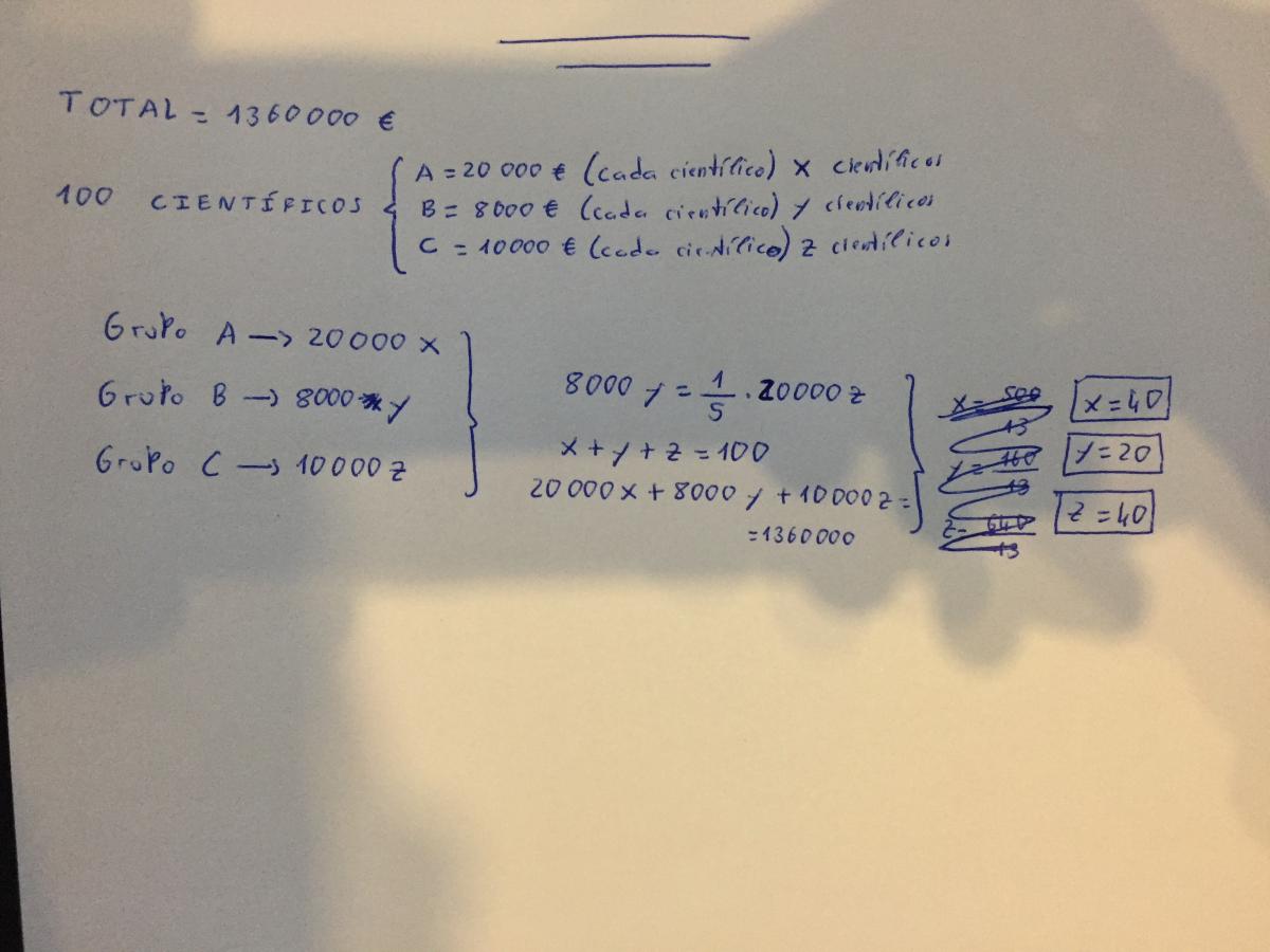 El departamento de innovación de una multinacional farmacéutica recibió una dotación de 1.360.000 € para realizar investigaciones sobre un nuevo fármaco. El dinero se dividió entre 100 científicos de tres grupos de investigación: A, B, C. Cada científico del grupo A recibió 20.000 €; cada científico del B, 8.000 € y cada uno del C recibió 10.000 €. El grupo de investigación B recibió la quinta parte de los fondos del grupo A. ¿Cuántos científicos pertenecen a cada grupo?
