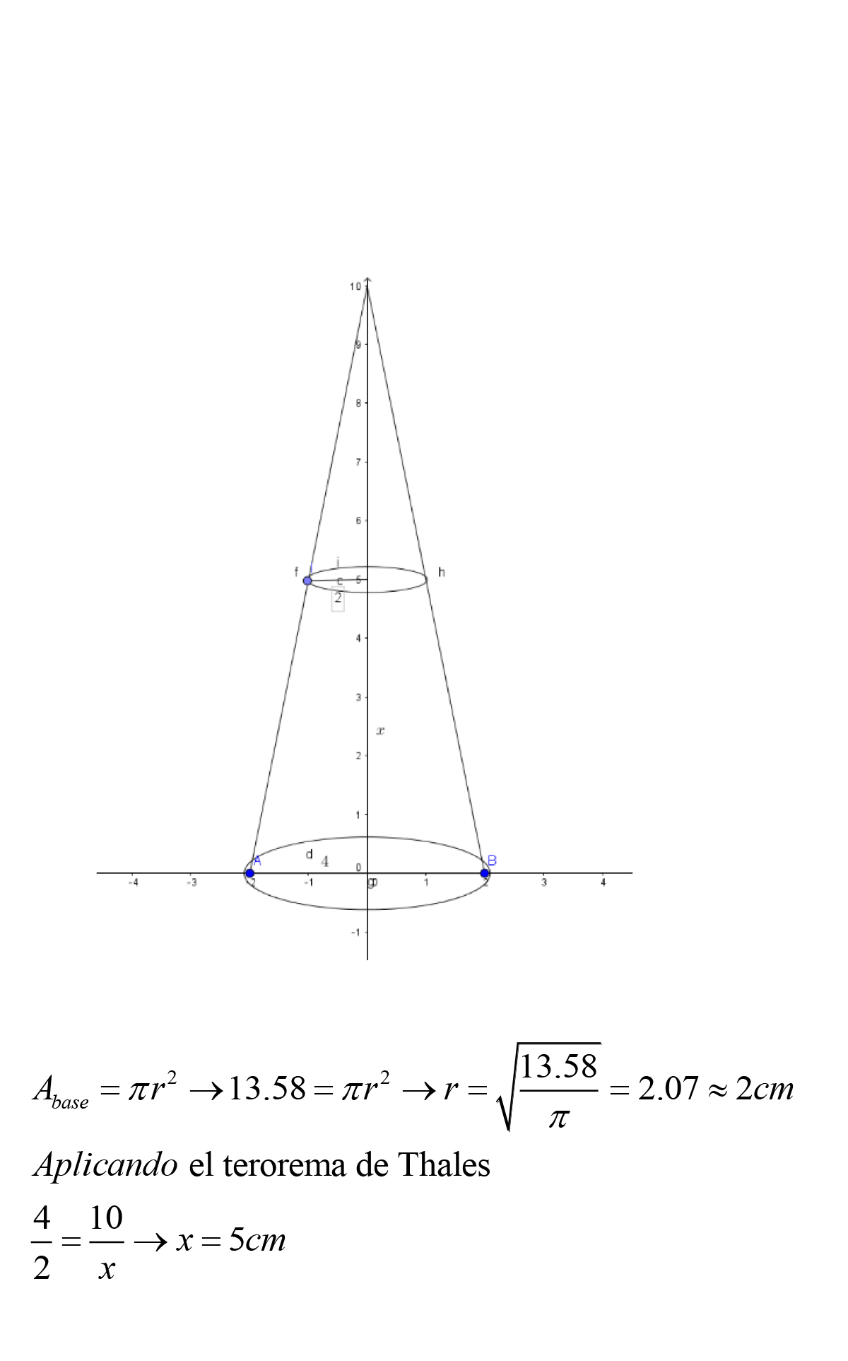 ■ Se secciona un cono de 10 cm de altura y 4 cm de radio por un plano paralelo a la base. Si el área de la sección obtenida es 13.58 cm2, ¿A qué distancia se encuentra la base del cono de dicho plano?