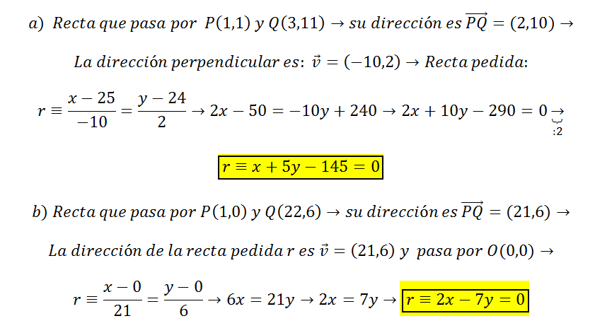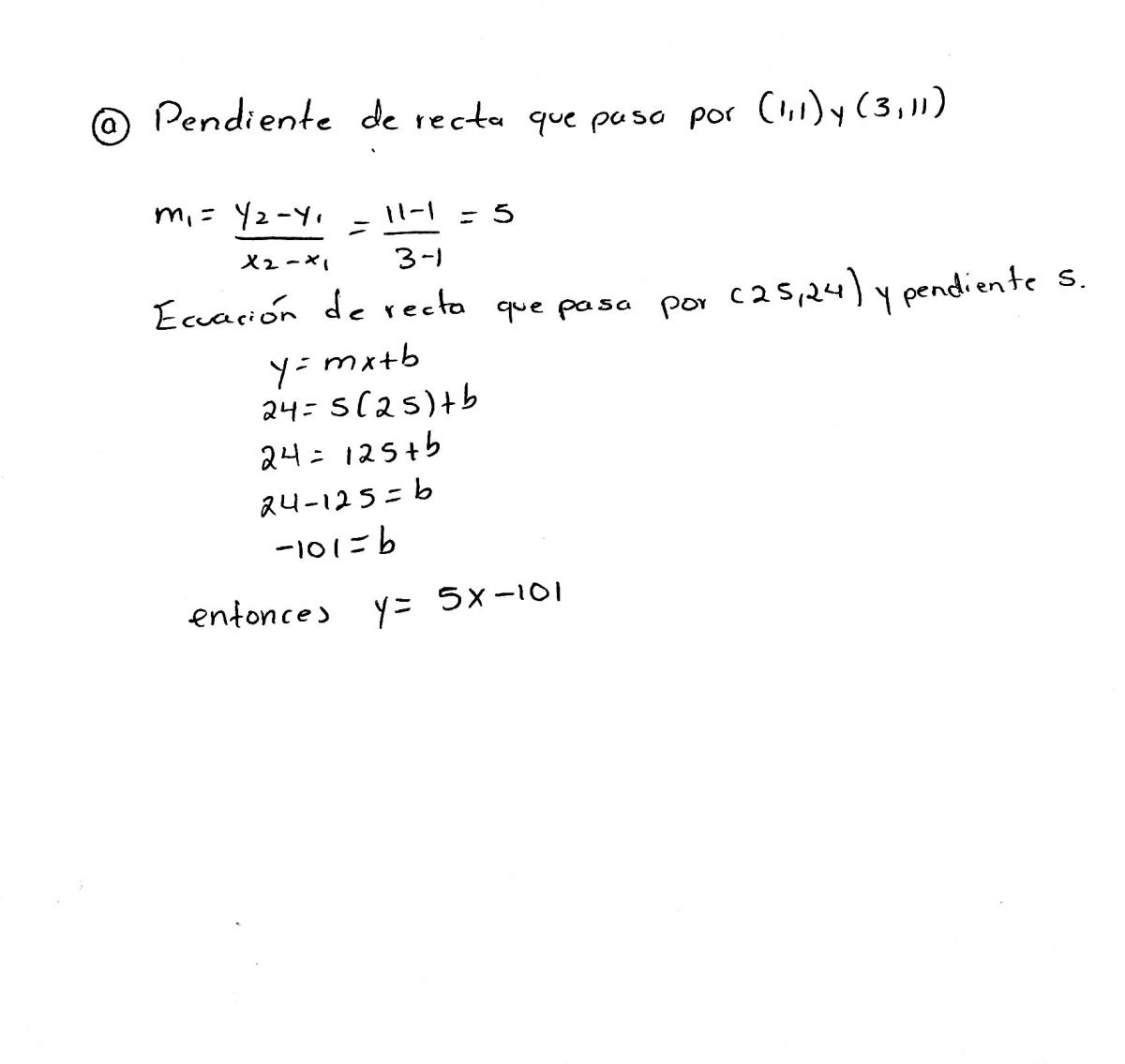 a) Pasa por (25, 24) y es perpendicular a la recta que pasa por (1, 1) y (3, 11).
