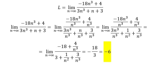 Lím(n→+∞) (-18 + 4/n3) / (3 + 1/n2 + 3/n3) = resolvemos = (-18 + 0) / (3 + 0 + 0) = - 18/3 = - 6.