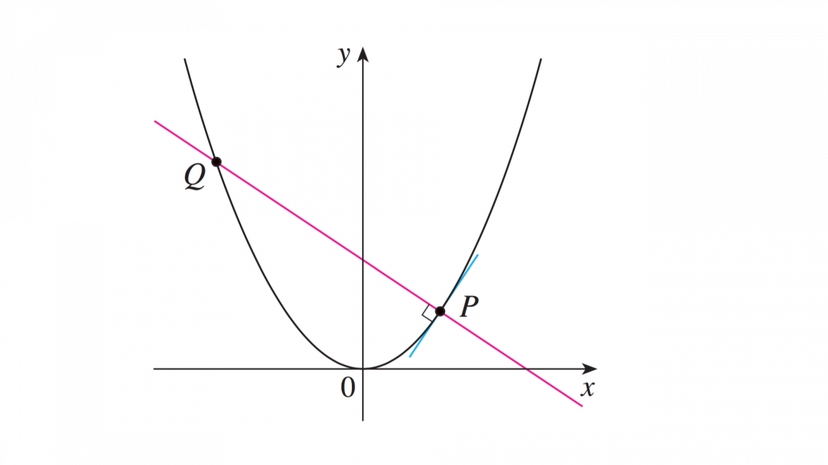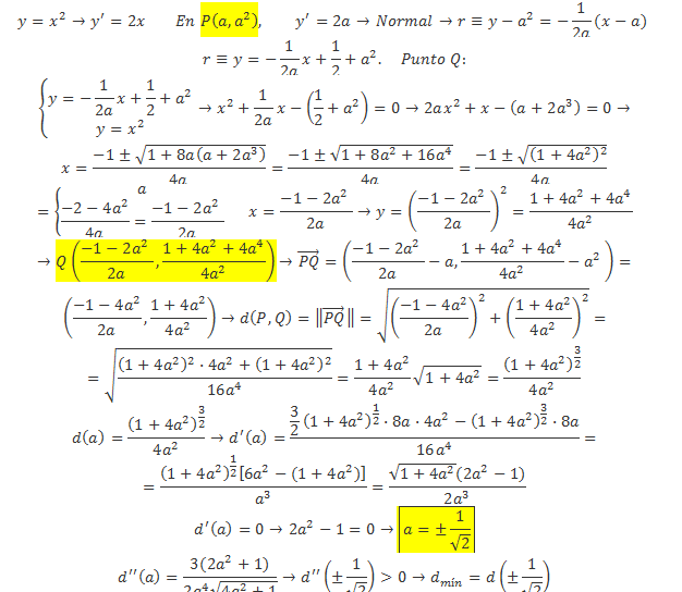 Si P(a, a2) es cualquier punto sobre la parábola y = x2, excepto en el origen, sea Q el punto donde la recta normal cruza la parábola una vez más (véase la figura). Demuestra que el segmento de recta PQ tiene la longitud más corta posible cuando a = 1/√2.