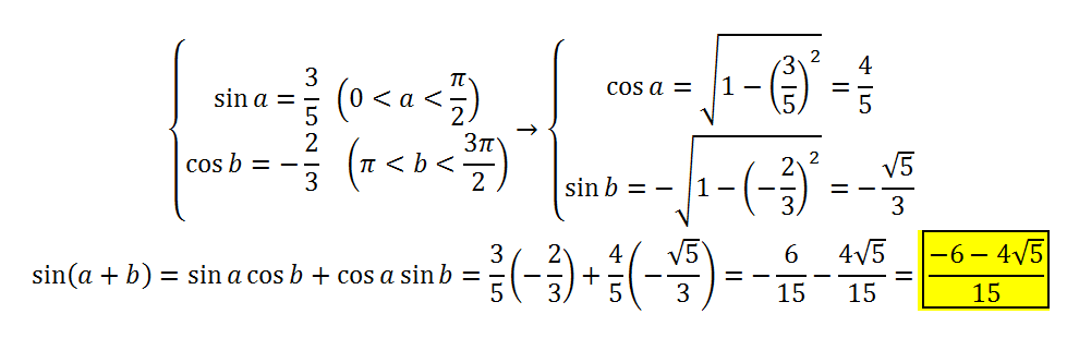 Sabemos que senα=3/5 con 0<α<π/2, cosβ=-2/3 con π<β<3π/2, sin hallar el valor de los ángulos y expresando el resultado con radicales calcula senα+β