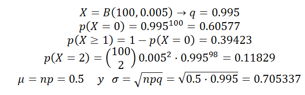 1) El 0'5% de las bombillas son defectuosas. Se venden 100. Halla la probabilidad de que en un paquete de 100 haya: