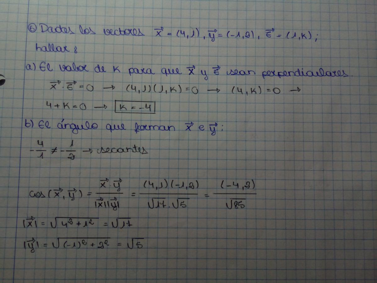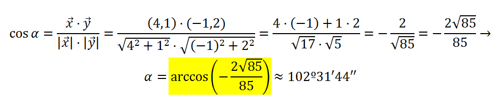 Tu fallo reside en el cálculo del producto escalar, sean los vectores u=(a,b) , v=(c,d) , u·v=(ac+bd) , intentalo de nuevo, el angulo tiene que darte de 102.52º