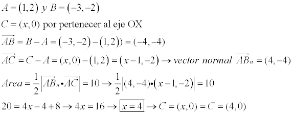 Hola, alguien sería tan amable de echarme un cable con esto: El área de un triángulo es de 10 u2 . Dos de sus vértices son A=(1,2) y B=(-3,-2). El tercer vértice está en el eje OX. Obtén el triángulo. Mil gracias :)