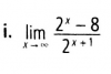 Lím(x→∞) (2x - 8)/2x+1 = sustituimos = Lím(x→∞) (2-1 - 8/2x+1) = resolvemos = 2-1- 0 = 1/2.