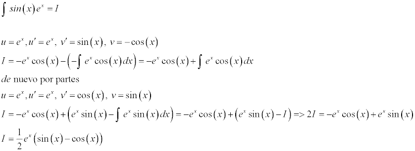 2*I = senx*ex - cosx*ex, multiplicamos en todos los términos de la ecuación por 1/2, sumamos la constante de integración y queda: