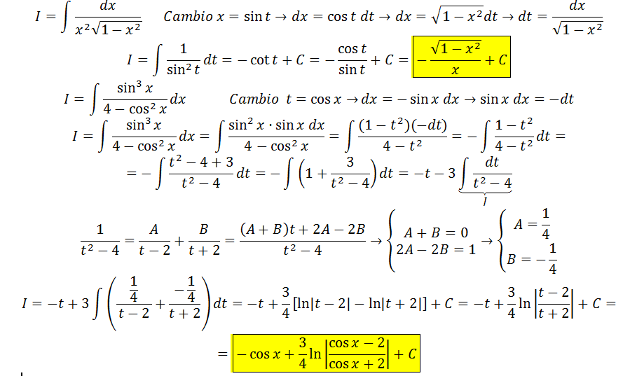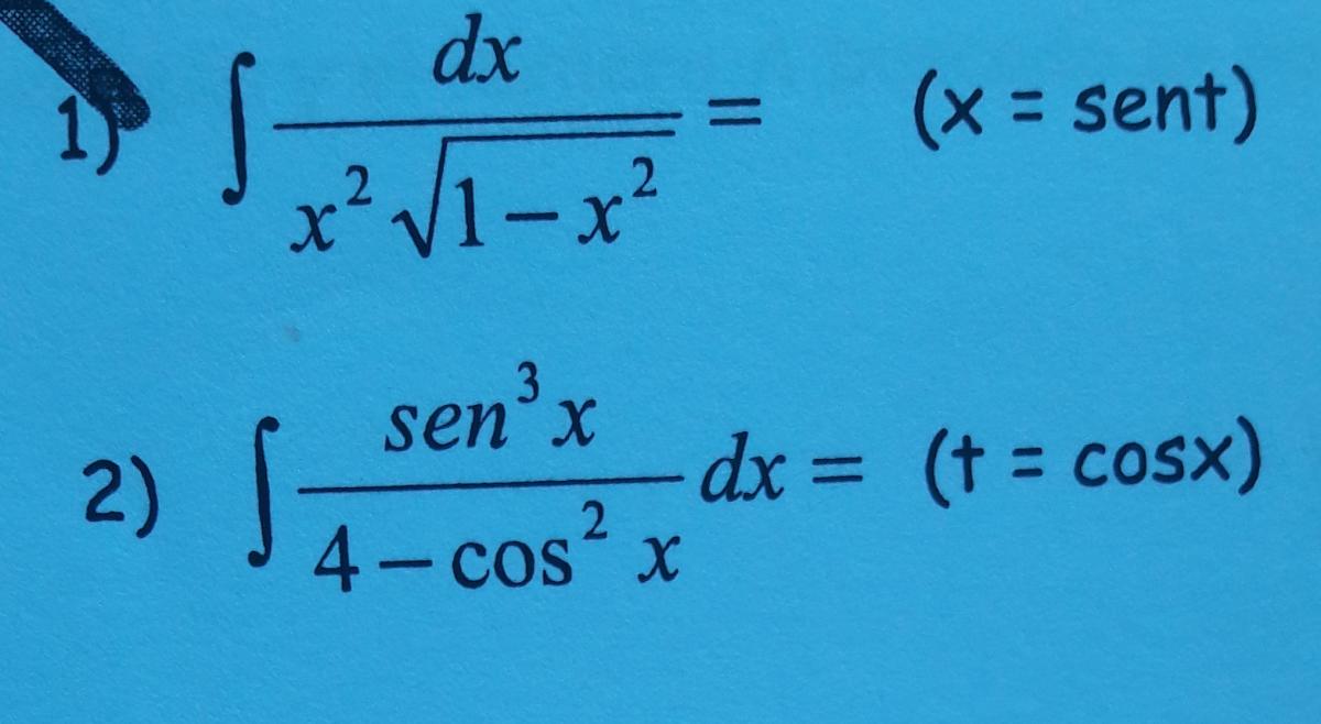 luego tienes el cambio de variable: t = cosx, de donde tienes: dt = - senx*dx, y también tienes: - dt = senx*dx, luego sustituyes y queda: