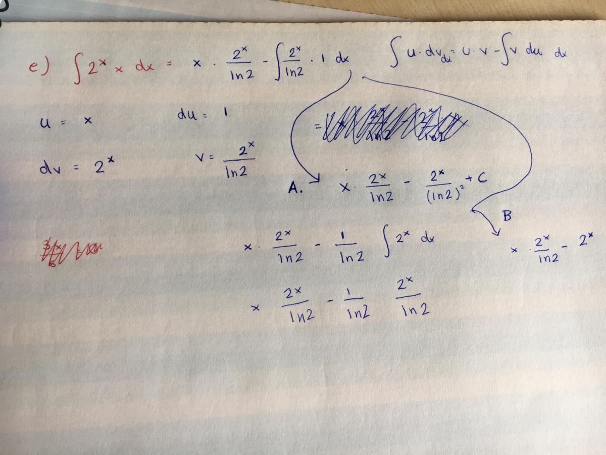 I = x*2x/ln2 - (1/ln2) * 2x/ln2 + C = x*2x/ln2 - ( 1/(ln2)2 ) * 2x + C = x*2x/ln2 - 2x/(ln2)2 + C.