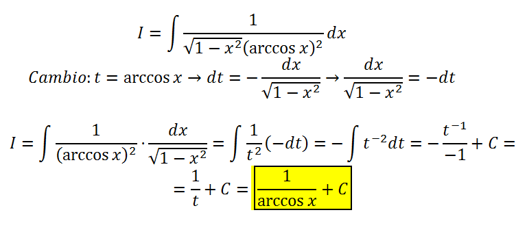 I = ∫ cost*dt / (sen2t*cost) = simplificas = I = ∫ (1/sen2t)*dt = - cotg(t) + C = sustituyes la expresión señalada (1) = - cotg(arcsenx) + C.