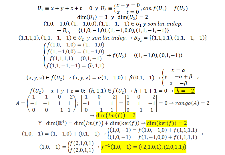 1) Halla razonadamente las dimensiones del Ker f y la de Im f y el valor del parámetro h que hace posible las condiciones del enunciado