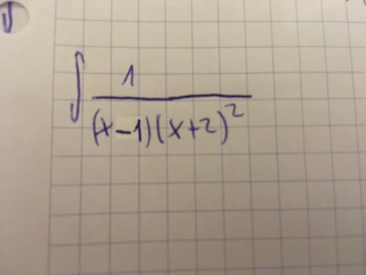 1 / (x-1)(x+2)2 = a/(x-1) + b/(x+2) + c/(x+2)2 = ( a(x+2)2 + b(x-1)(x+2) + c(x-1) ) / (x-1)(x+2)2