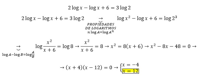Observa que x debe ser estrictamente mayor que cero para que exista el logaritmo del primer término, y observa también que x debe ser estrictamente mayor que - 6 para que exista el logaritmo del segundo término, por lo que los valores de x que sean solución de la ecuación logarítmica del enunciado deben ser estrictamente mayores que cero.