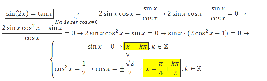 sen(2x) = tanx----->RTA----->x = kπ; x = π/4 + k π/2