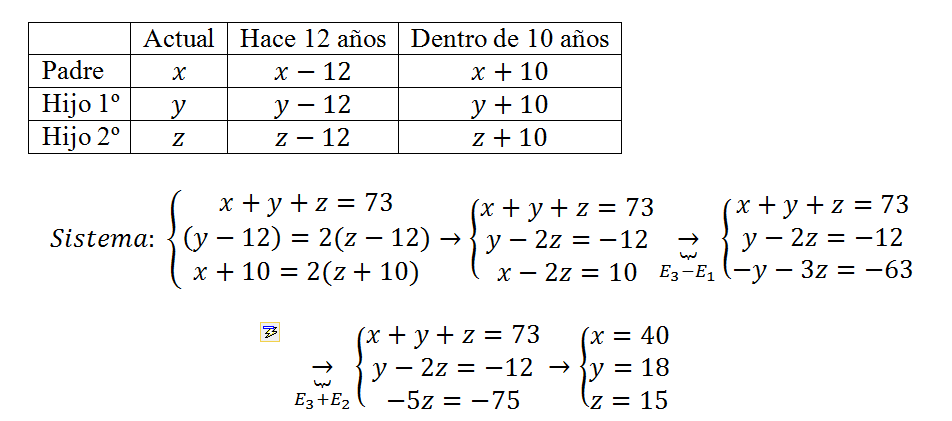 La suma de las edades, en el momento actual, de un padre y sus dos hijos es de 73 años. Hace 12 años, la edad del hijo mayor era el doble de la de su hermano pequeño, y dentro de 10 años, la edad del padre será el doble que la del hijo menor. Calcula las edades actuales de cada uno de ellos.