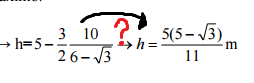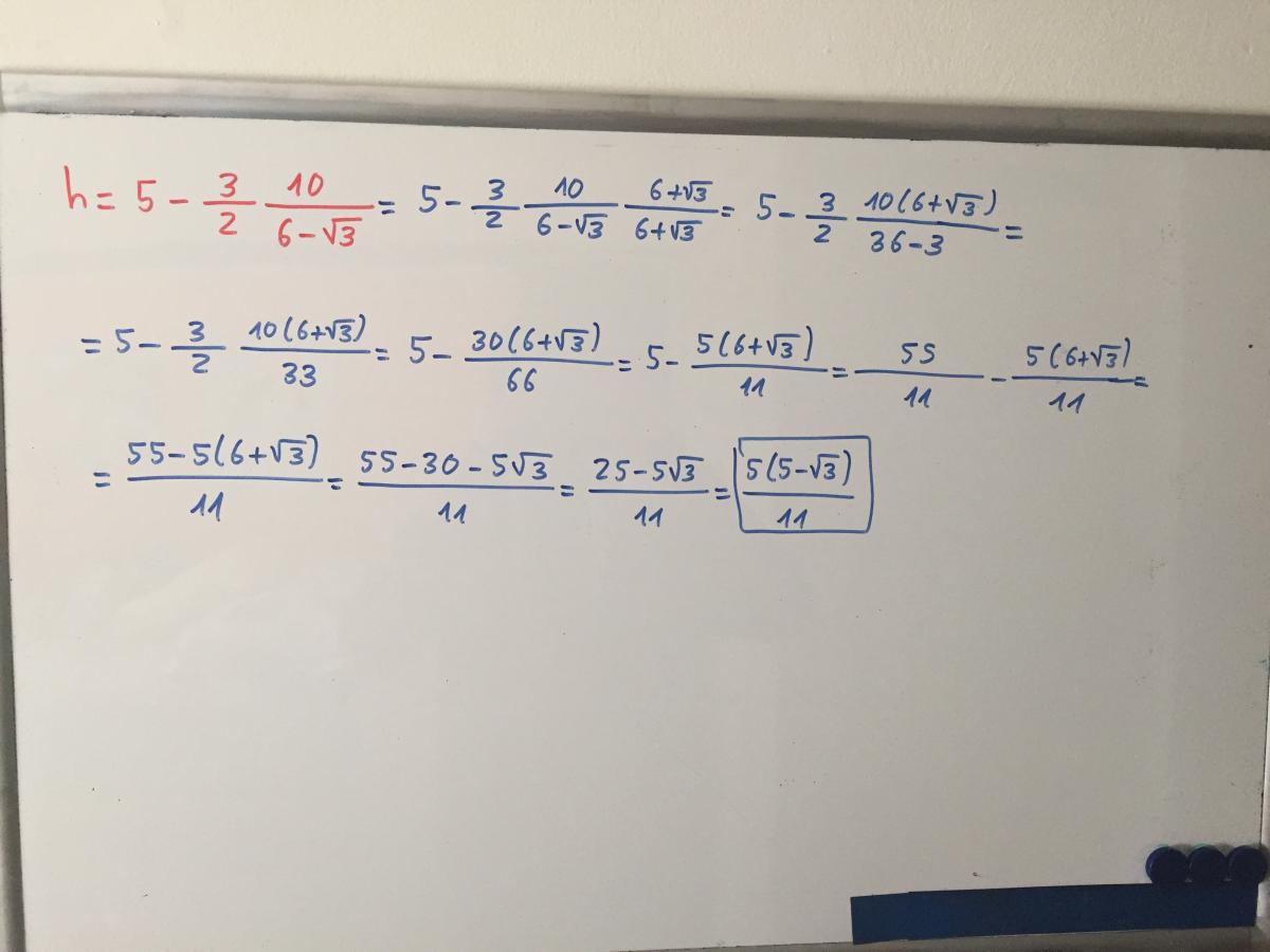 h = 5 - (3/2)*(10 / ( 6-√(3) )) = reemplazamos = 5 - (3/2)*10*( 6+√(3) )/33 = ordenamos factores en el segundo término y queda: