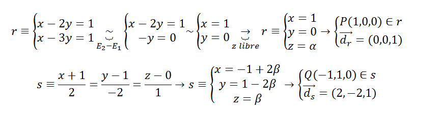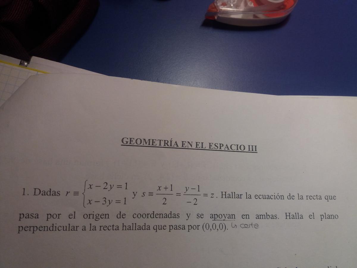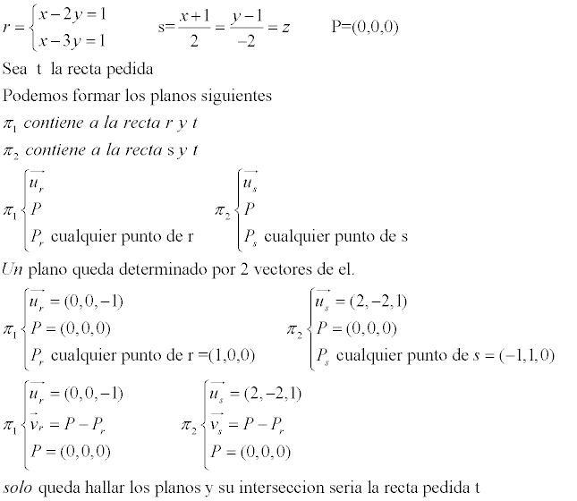 He hallado la posición de ambas rectas y he obtenido que se cruzan, pues bien. He ido a calcular el plano que contiene a r y que pasa por (0,0,0), para después hallar su punto de corte con la recta s. Y de esta manera obtener la recta t que me piden gracias a que tendré el (0,0,0) el punto de corte con s, y el vector entre ellas, pero no sé por qué no soy capaz de hallar el plano, tomo Vr, el vector Pr a (0,0,0) y el punto (0,0,0)