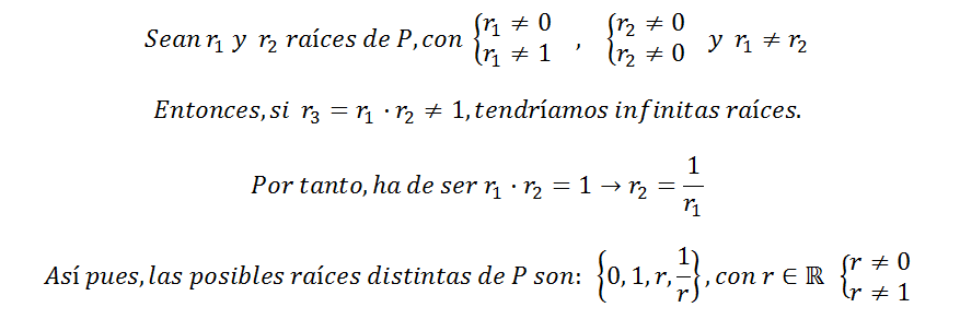 Hola, hoy he ido a la Olimpiada de matemáticas y había un ejercicio que decía: Calcular el número de raíces reales distintas que puede tener un polinomio P que verifique la siguiente propiedad: El producto de dos raíces distintas de P sigue siendo una raíz de P