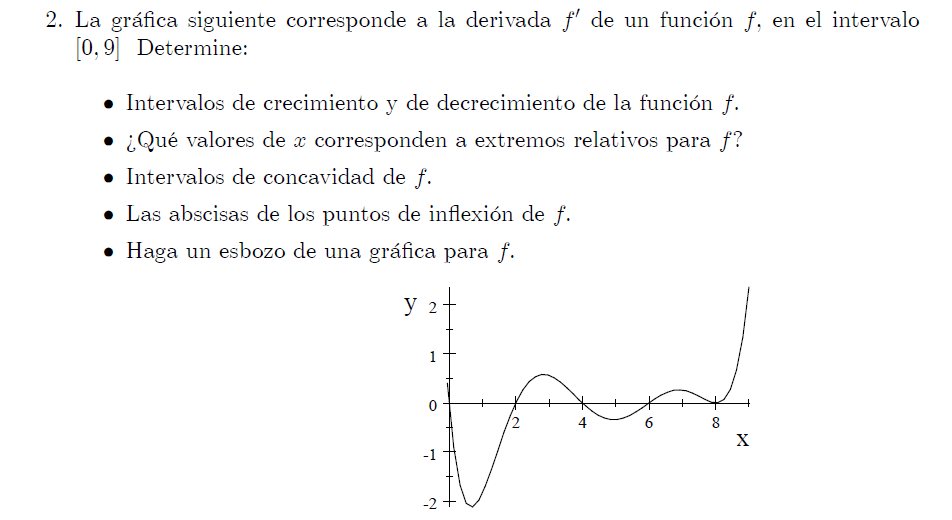 6) intervalos de concavidad hacia abajo de f: f ' ' (x) < 0, que equivale a decir que f ' (x) es decreciente, por lo tanto buscamos intervalos de decrecimiento en la gráfica de f ';