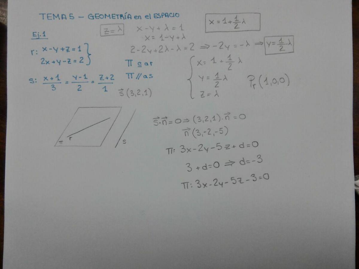 y que el punto de coordenadas A(1,0,0) pertenece a la recta r y, por lo tanto, el punto A(1,0,0) también pertenece al plano que incluye a la recta r.