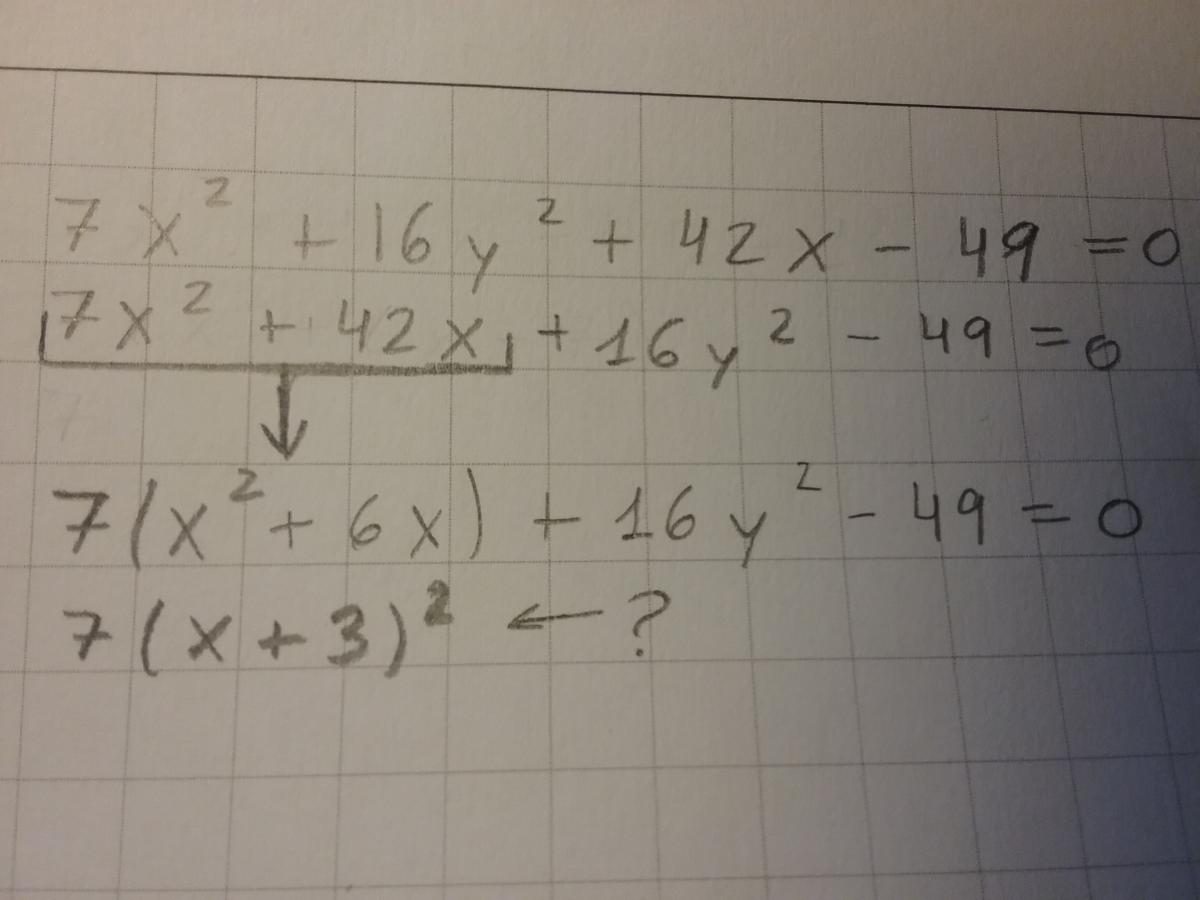 7x2 + 42x + 16y2 = 49, extraemos factor común numérico en los términos con incógnita x y queda: