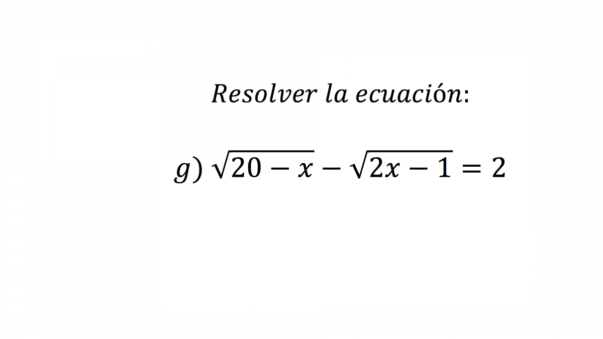 V(20-x) = 2 + V(2x-1), luego elevamos al cuadrado en ambos miembros y queda: